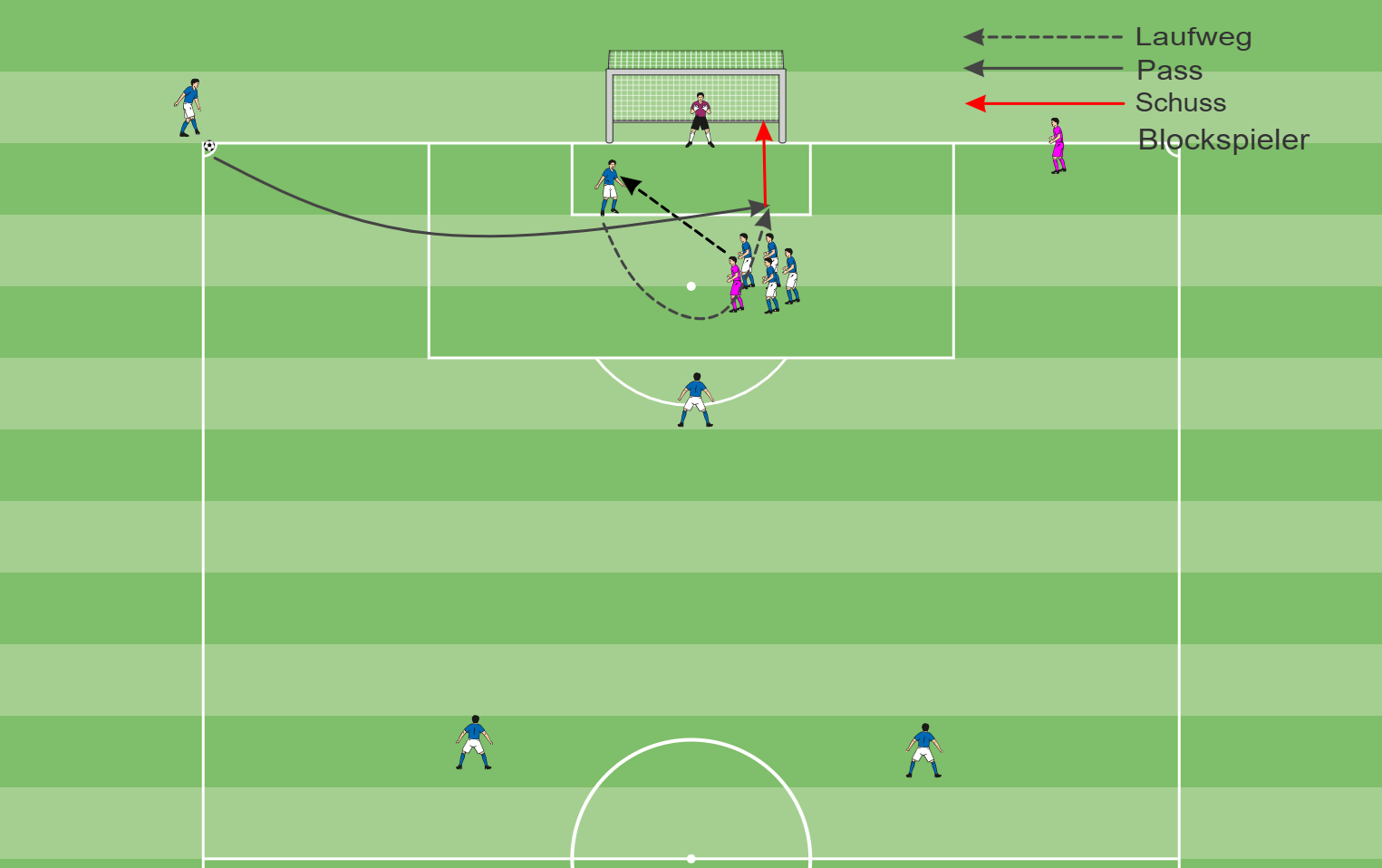 Ziel des Laufs ist, dass er die Hereingabe verwertet, sollte der Ball am Blockvorbeifliegen oder auch verlängert werden.